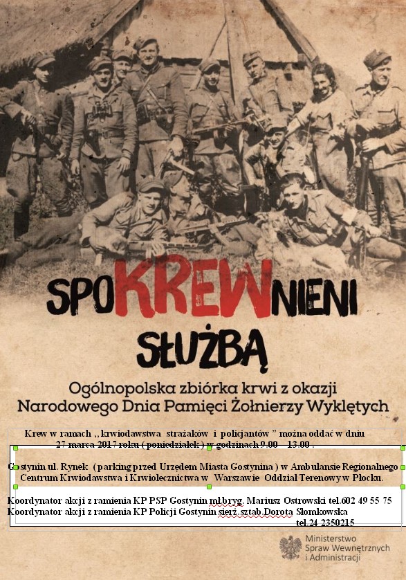 Akcja prowadzona jest na terenie całego kraju w okresie 1.03 -31.03.2017 roku, w ramach której funkcjonariusze służb podległych MSWiA, w hołdzie Żołnierzom Wyklętym, oddają krew dla osób chorych oraz ofiarom wypadków.