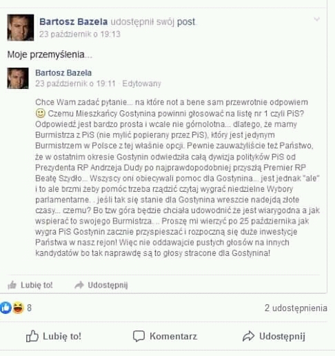 „Chce Wam zadać pytanie... na które nota bene sam przewrotnie odpowiem. Czemu Mieszkańcy Gostynina powinni głosować na listę nr 1 czyli PiS? Odpowiedź jest bardzo prosta i wcale nie górnolotna... dlatego, że mamy Burmistrza z PiS (nie mylić popierany przez PiS), który jest jedynym Burmistrzem w Polsce z tej właśnie opcji. Pewnie zauważyliście też Państwo, że w ostatnim okresie Gostynin odwiedziła całą dywizja polityków PiS od Prezydenta RP Andrzeja Dudy po najprawdopodobniej przyszła, Premier RP Beatę Szydło... Wszyscy oni obiecywali pomoc dla Gostynina... jest jednak „ale'” i to ale brzmi żeby pomóc trzeba rządzić czytaj wygrać niedzielne Wybory parlamentarne.. jeśli tak się stanie dla Gostynina wreszcie nadejdą złote czasy... czemu? Bo tzw. góra będzie chciała udowodnić, że jest wiarygodna a jak wspierać to swojego Burmistrza... Proszę mi wierzyć po 25 października jak wygra PiS Gostynin zacznie przyspieszać i rozpoczną się duże inwestycje Państwa w nasz rejon! Więc nie oddawajcie pustych głosów na Innych kandydatów bo tak naprawdę są to głosy stracone dla Gostynina!”
