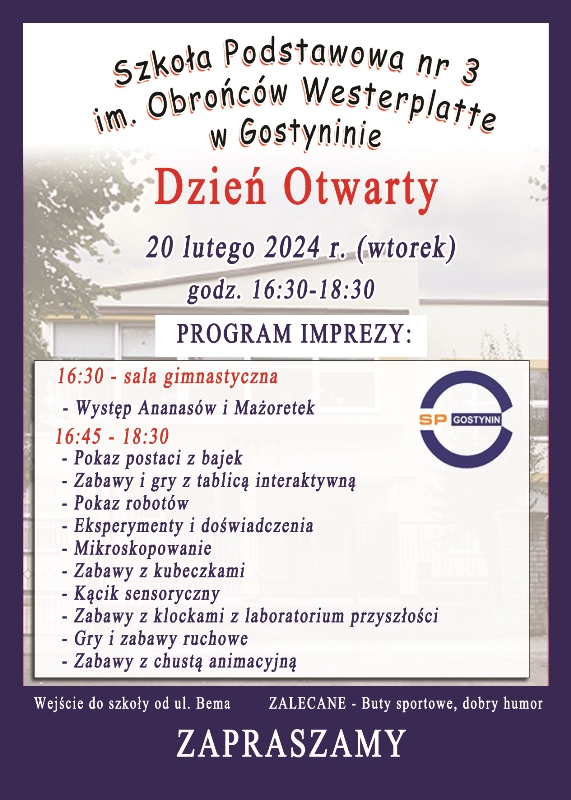 Szkoła Podstawowa nr 3 w Gostyninie zaprasza na Dzień Otwarty, który odbędzie się we wtorek, 20 lutego 2024 roku w godzinach 16:30 - 18:30.