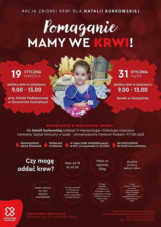 W najbliższy piątek (31 stycznia br.) w godzinach 9:00-13:00 na Rynku w Gostyninie odbędzie się zbiórka krwi dla 4-letnie Natalki Kurkowskiej. U dziewczynki lekarze zdiagnozowali ostrą białaczkę limfoblastyczną.