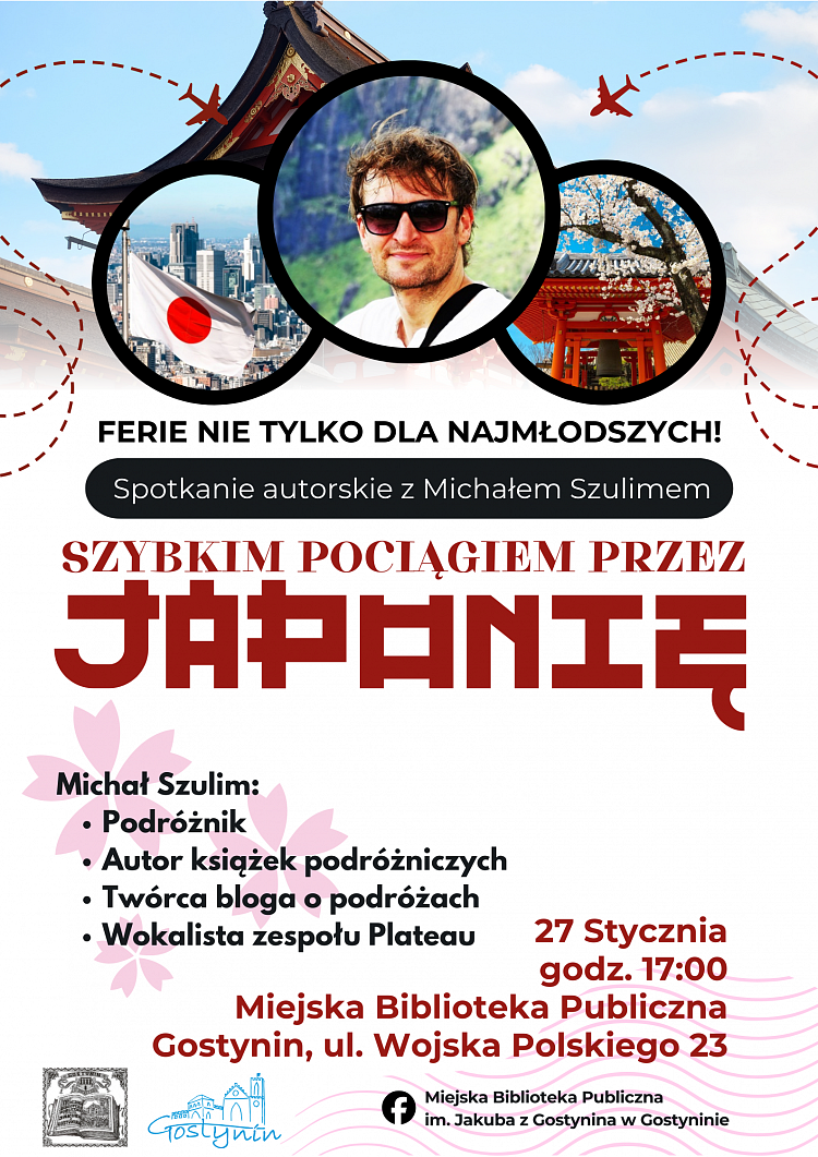 Miejska Biblioteka Publiczna w Gostyninie przygotowała na zimowe popołudnie. Już w najbliższy wtorek, 27 stycznia, mieszkańcy naszego miasta będą mieli okazję wyruszyć w wirtualną podróż do Kraju Kwitnącej Wiśni. Gościem specjalnym spotkania autorskiego będzie znany podróżnik i artysta – Michał Szulim.