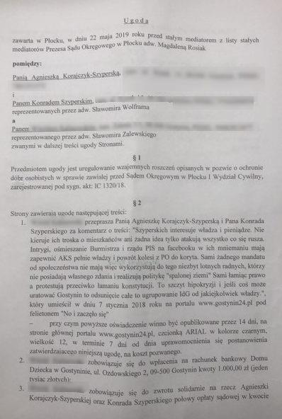 Autor komentarza zobowiązał się do opublikowania na własny koszt oświadczenia na portalu www.gostynin24.pl, przepraszającego Agnieszkę Korajczyk-Szyperską i Konrada Szyperskiego przez 14 dni czcionką ARIAL w kolorze czarnym, wielkość 12, w terminie 7 dni od dnia uprawomocnienia się postępowania zatwierdzającego ugodę a ponadto zobowiązał się do wpłacenia na rachunek bankowy Domu Dziecka w Gostyninie, ul. Ozdowskiego 2, 09-500 Gostynin, kwoty 1 000 złotych oraz zwrotu solidarnie na rzecz Agnieszki Korajczyk-Szyperskiej oraz Konrada Szyperskiego połowy opłaty sadowej w kwocie 375 złotych.